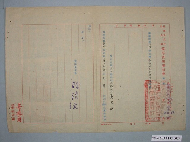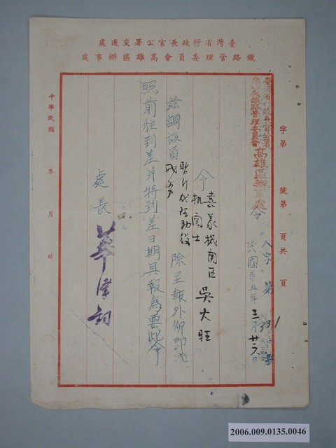 2006.009.0135.0060 臺灣省政府交通處鐵路管理局吳火旺調職令