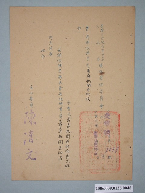 2006.009.0135.0046 民國35年臺灣省行政長官公署嘉義機關區機關士吳火旺調派令