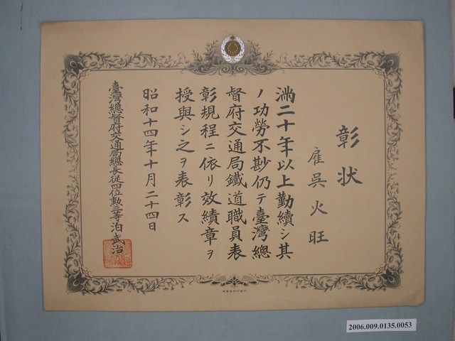 2006.009.0135.0053 昭和14年臺灣總督府交通局雇吳火旺表彰狀