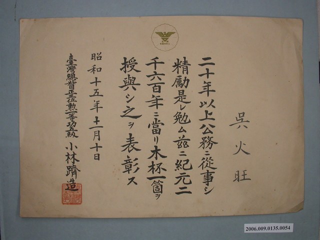 2006.009.0135.0054 昭和15年臺灣總督府給吳火旺表彰狀