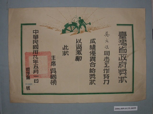 2006.009.0135.0055 民國39年臺灣省政府給吳火旺獎狀