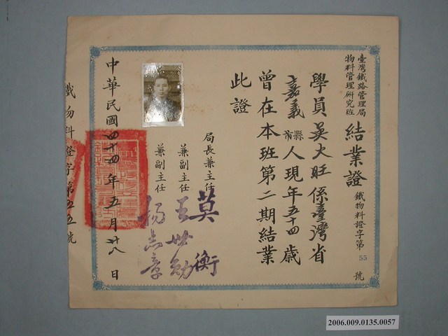 2006.009.0135.0057 民國44年臺灣鐵路管理局物料管理研究班吳火旺結業證