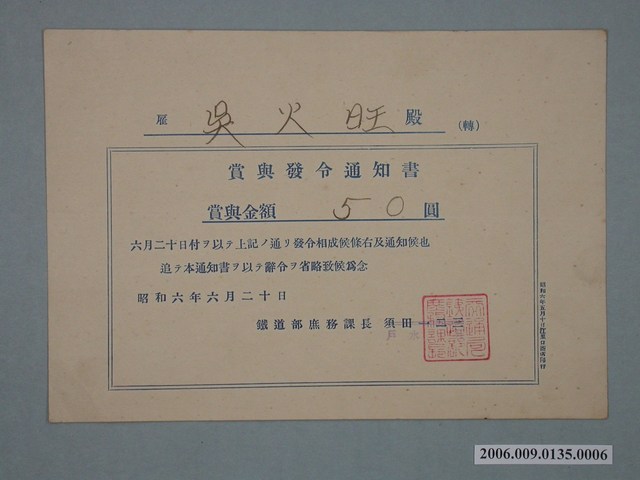 2006.009.0135.0006 昭和6年雇吳火旺獎賞通知書