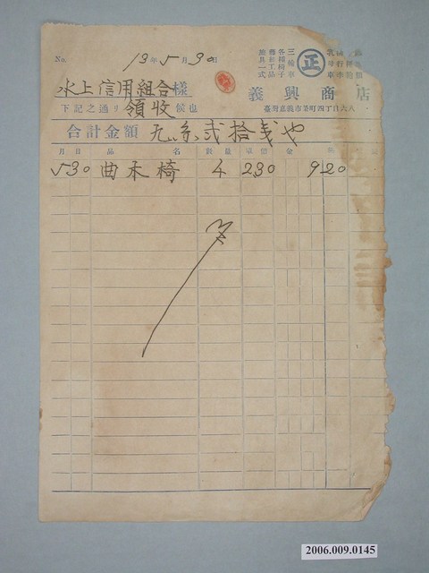 2006.009.0145 昭和13年嘉義市義興商店給水上信用組合收據