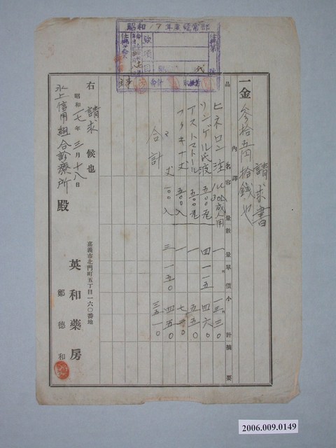 2006.009.0149 昭和17年嘉義市英和藥房給水上信用組合診療所請求書