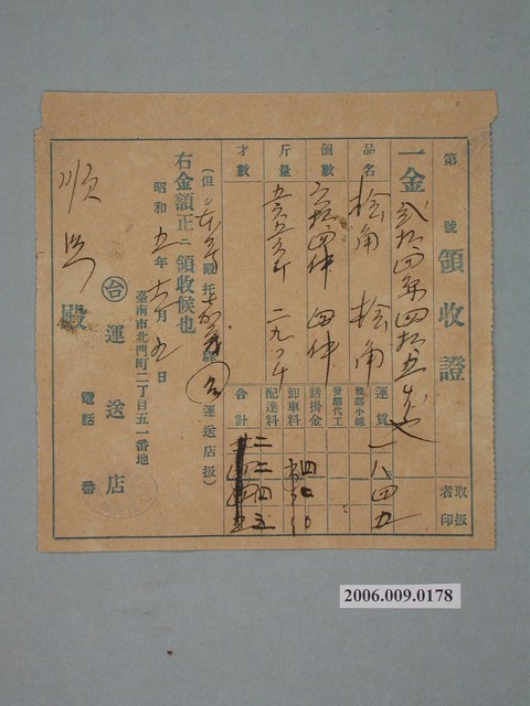 2006.009.0178 昭和5年臺南運送店給順興商號收據