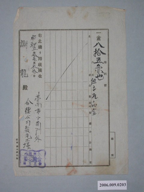 2006.009.0203 昭和5年臺南市合德公司製瓦工場給謝龍收據