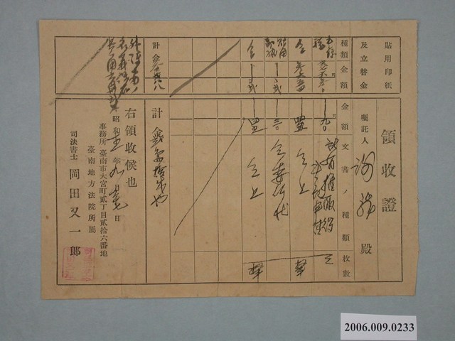2006.009.0233 昭和12年司法書士岡田又一郎給謝龍收據