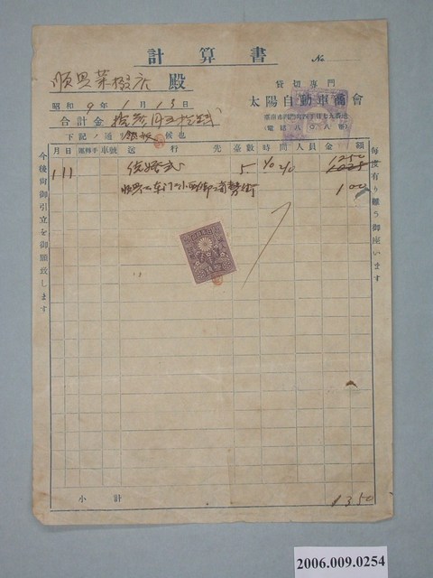 2006.009.0254 昭和9年臺南市太陽自動車商會給順興業棳店收據