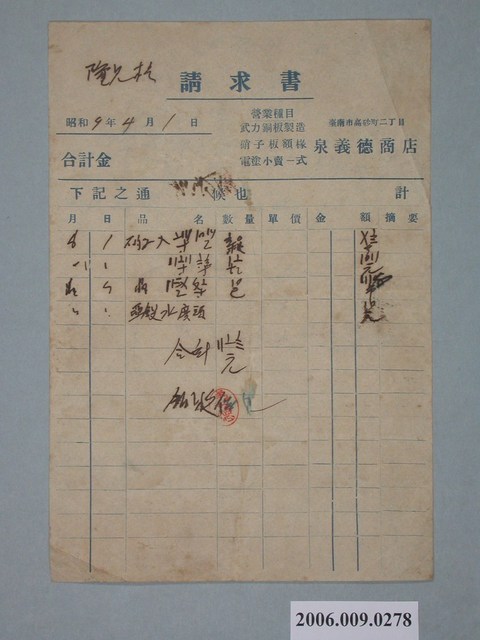 2006.009.0278 昭和9年臺南市泉義德商店給隆兄付款請求書