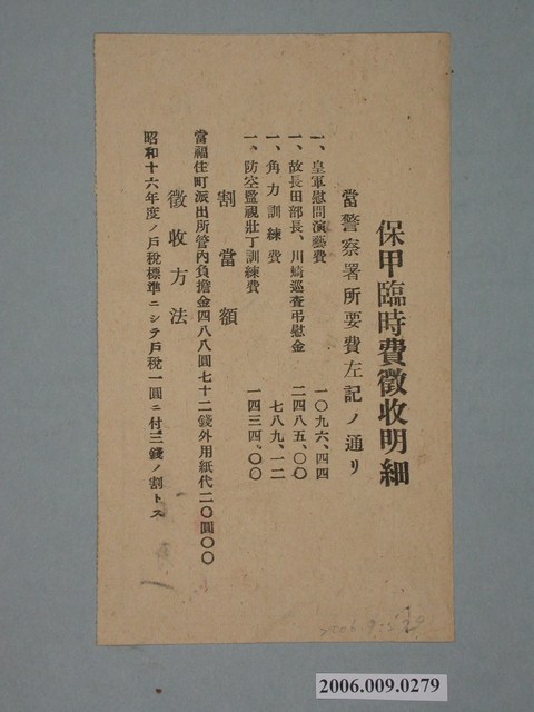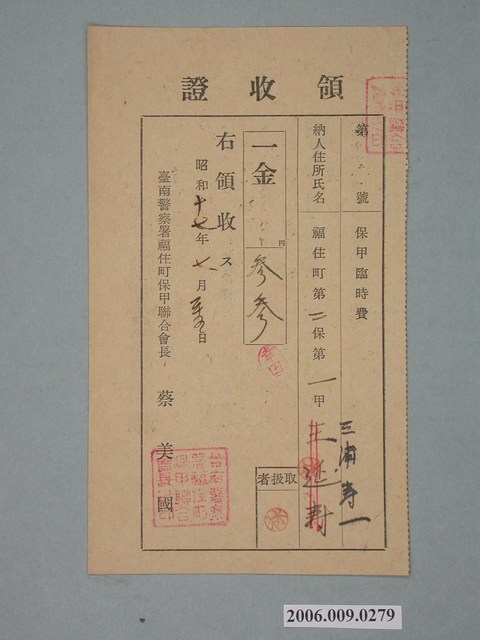 2006.009.0279 昭和17年臺南警察署福住町保甲聯合會長蔡美國給三浦壽一收據