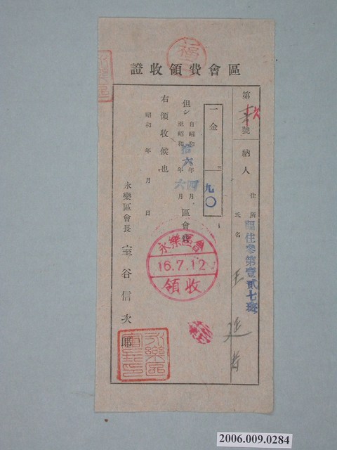 2006.009.0284 昭和16年臺南市永樂區長室谷信次郎給王延壽區會費收據