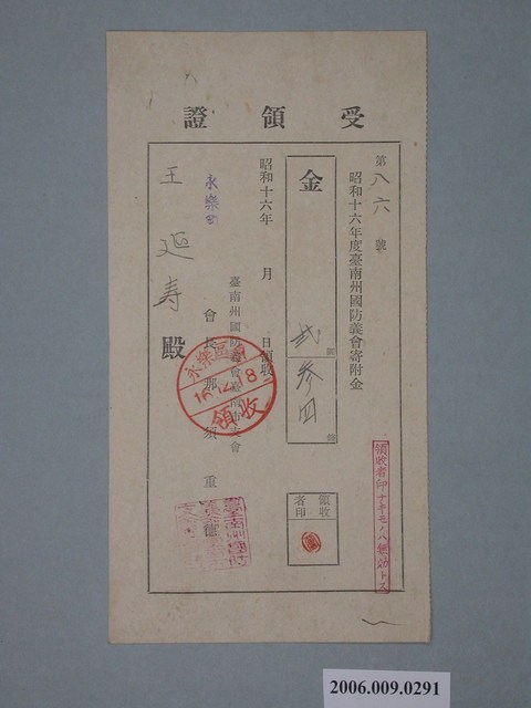2006.009.0291 昭和16年臺南州國防義會臺南市支會永樂町會長那須重德給王延壽收據