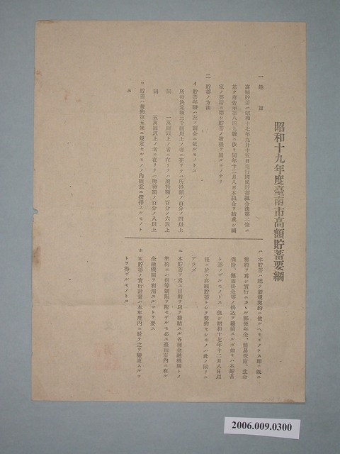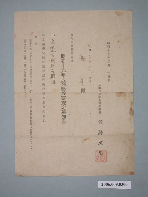 2006.009.0300 昭和19年臺南市高額貯蓄組合發給謝龍查定通知書及貯蓄要綱
