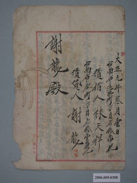 2006.009.0308 大正9年謝龍收執家屋賃貸借契約書