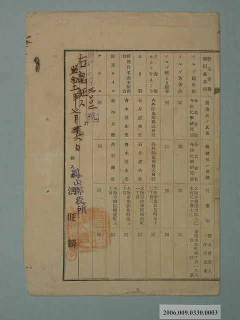 本物件為藥局文物,是賣藥販賣品目追加屆,紙張標題為移入賣藥類似品品目,內容有品名、製造者名字、營業所等資訊。