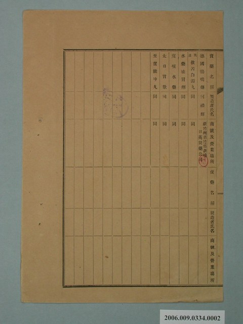 1. 本物件為藥局文物之賣藥目錄 何扶元大藥房。賣藥目錄上有三個欄位,分別是賣藥名稱、製造者氏名、商號及營業場所。商號氏名為何扶元大藥房何阿坑和日英製藥公司何禮輝,藥名有34種,例有扶元癬藥水、英國大豬藥和日英齒痛液等。 2. 依物件的地址標示來看,應為日本時代產物。