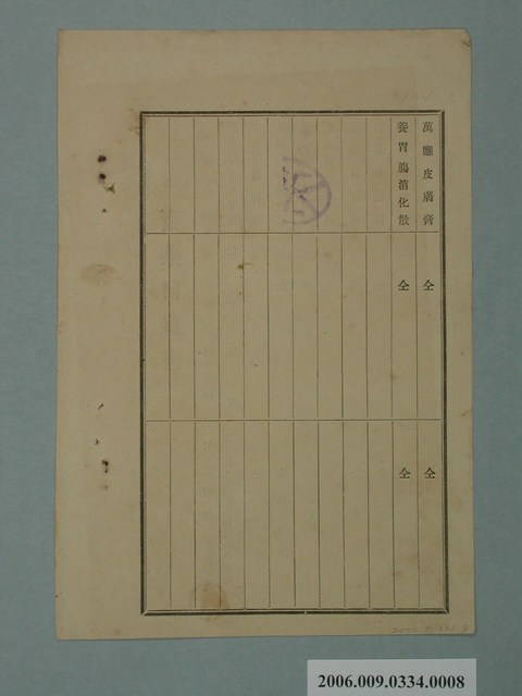 1. 本物件為藥局文物之賣藥目錄書 仁和藥房。賣藥品目書上有三個欄位,分別是賣藥名稱、賣藥商號、製造者住所氏名。商號氏名為仁和藥房張水印,藥名共有11種,例有仁和鎮咳錠、仁和淋病藥和補爾多精等。 2. 依物件的地址標示來看,應為日本時代產物。
