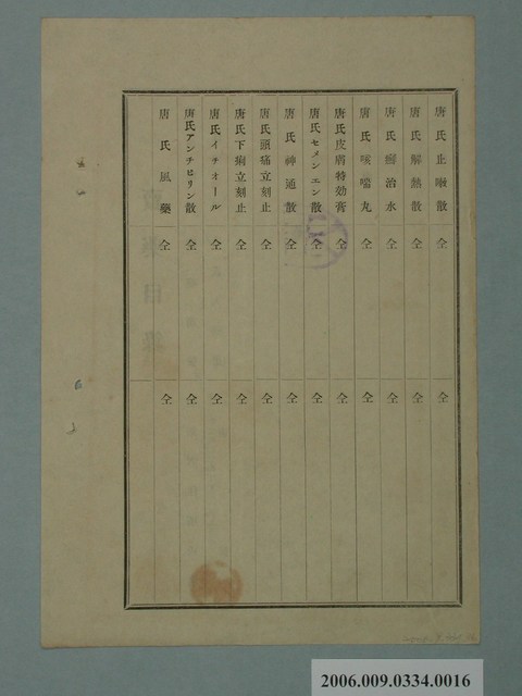 1. 本物件為藥局文物之賣藥目錄 唐氏大藥房。賣藥目錄上有三個欄位,分別是賣藥種目、賣藥商號及製造者住所氏名。商號氏名為唐氏大藥房唐獅,藥名共有22種,例有唐氏平安散、唐氏頭痛立刻止和唐氏滋仙丹等。 2. 依物件的地址標示來看,應為日本時代產物。