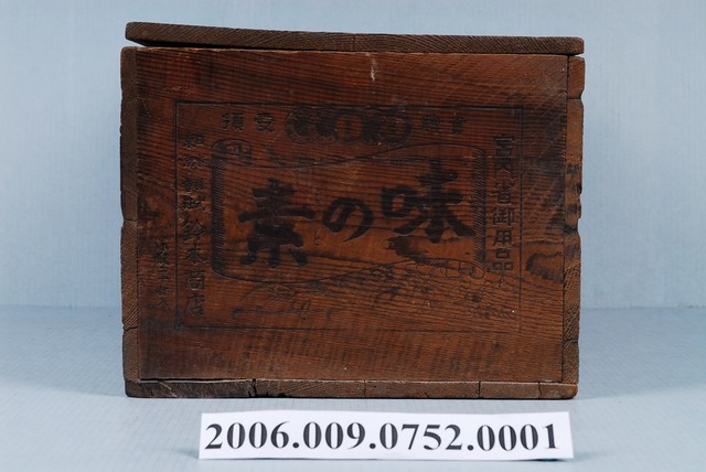 本件外包裝木箱為株式會社鈴木商店製味之素外包裝木箱及文書之部件1,採用6片桐木板以鐵釘釘固組合,呈長55.5公分,寬36.2公分,高27.8公分之長方形,作頂面開口,長邊一側以2片金屬絞鍊固定可上掀開啟。其立面皆以烙印方式打上商品名稱與圖案,正面與背面為相同設計,作橫式長方形框,上端印有「AJI-NO-MOTO」,下接片假名,底緣為鈴木商店之英文名稱。版面右佐以直式雙尖狀橢圓作框內印身穿印有味之素字樣的圍裙之婦女圖像為註冊商標。其左右立面也呈相同版面設計,中央處以書卷框內印「味の素」,上端為獲獎之獎牌圖像,右側印有「宮內省御用品」,左側為「日本東京株式會社鈴木商店」,下底緣處以小麥麥穗與黃豆豆莢圖樣裝飾。木箱為裝盛小瓶味素之用,可放置20打共240瓶的數量。