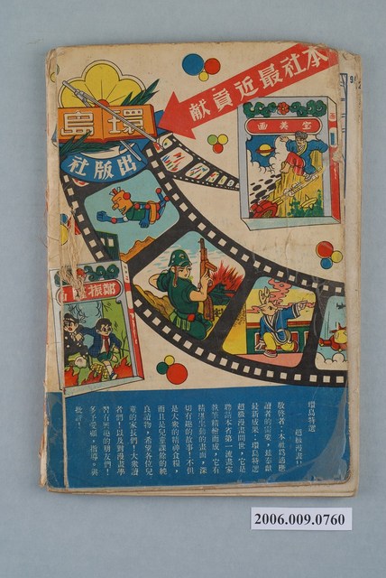 本件《恭賀新禧》的封面為過年時穿新衣在門口放鞭炮的畫面。上方有雲紋,橫書「恭賀新禧」,左下角有破損,右側有鑽孔穿線固定,以釘書針裝訂,背面有環島出版社字樣,以及底片圖案,外觀老舊,保存情況不佳。