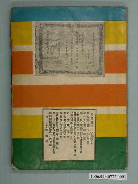 1.本件為葉宏甲《神童靈犬》第1集,一共有4集,為一部中國武俠漫畫,內容敘述白陽縣官的兒子少清生性聰明,身旁是一隻靈犬青玉,彼此默契絕佳,幫人民解決問題、打擊壞人的故事。封底有民國55年(1966)10月28日國立編譯館連環圖書畫審定執照的合格圖樣。