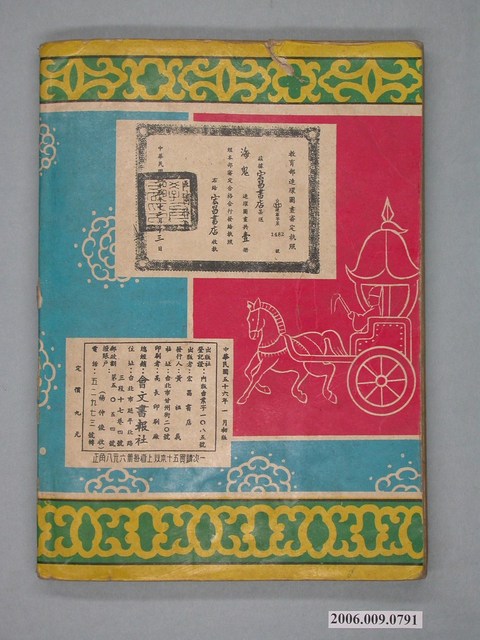 1.本件為宏昌書店《海鬼》,為一部神怪漫畫,內容敘述海底世界藏有海鬼,屢屢作怪造成社會動盪不安,最後派出艦隊順利擺平海鬼。封底有民國55年(1966)12月13日國立編譯館連環圖書畫審定執照的合格圖樣。2.漫畫是以圖像為呈現,具備繪畫、敘事、角色三要素,能因敘事而令圖像帶有個別意義、令作品內容獨立且完整的資訊載體。臺灣漫畫史上,民國55年(1966)實施「編印連環圖畫輔導辦法」嚴重衝擊漫畫創作,至民國76年(1987)解嚴,終止審查制度進入嶄新興盛的局面。