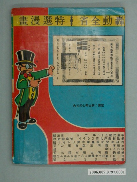 本件為《少年羅賓》漫畫書第1集,本書繪者為海文,由義明出版有限公司出版,民國58(1969)年11月出版,內政部登記證臺業字第0441號,定價為新台幣七元五角。本書保存狀態尚佳,書籍邊角些微磨損。