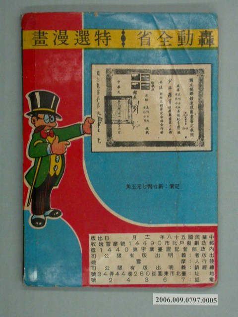本件為《少年羅賓》漫畫書第5集,本書繪者為海文,由義明出版有限公司出版,民國58(1969)年11月出版,內政部登記證臺業字第0441號,定價為新台幣七元五角。本書保存狀態尚佳,書籍邊角些微磨損。