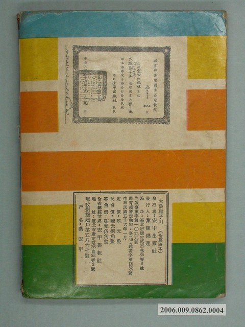 本書為《大破獅子山》漫畫書第4集,由宏甲出版社出版,葉宏甲著作,封面處有標示「葉宏甲新作」,於民國56年(1967)01月出版,定價為新台幣9元。
