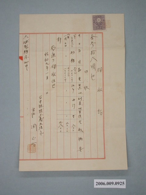 2006.009.0925 昭和9年臺中輕鐵木義出張所主任關正治給大埔製糖所收據