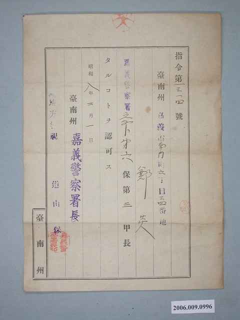 2006.009.0996 昭和8年嘉義警察署長第六保第三甲長任命指令