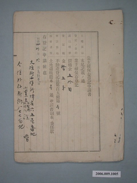 2006.009.1005 明治40年徐嘮立業主權保存登記申請書
