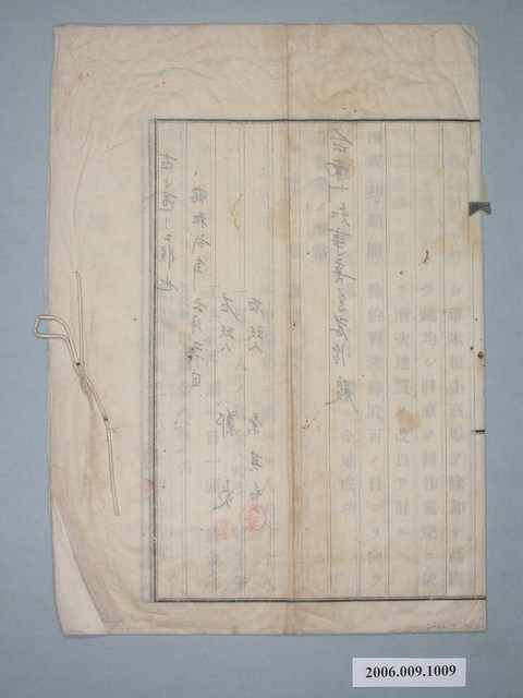 本件為昭和2年(1927)6月20日,鄭炎與蔡其名向臺灣總督府,提出購買位於臺南州虎尾郡(位於今雲林縣土庫鄉)。土庫庄龍巖兩則官有土地的購買申請書。此二則土地買入後,將開墾作為耕地使用。(原文如下)(第一頁)官有原野豫約賣渡願 臺南州虎尾郡土庫庄龍巖一七ノ六一番 一官有原野六甲壹分壹厘八毛五糸 臺南州虎尾郡土庫庄龍巖一七ノ五九番 一官有原野壹甲四分壹厘五毛 一箇年ノ貸付料一甲ニ付金 成功後ノ賣渡地代一甲ニ付金 右ハ臺灣官有森林原野豫約賣渡規則ヲ遵守シ,別紙起業方法書竝實測設計圖ノ