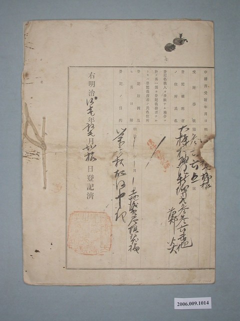 本件為明治41年(1908)11月20日,徐嘮與徐頂等業主權保存登記申請書。大槺榔西堡新埤庄六百五拾壹番地徐嘮與徐頂等人,因業主徐芳糖亡故,因此透過代理人倉田亮一,向臺南地方法院嘉義出張所樸仔腳登記所提出大槺榔西堡新埤庄業主權保存登記。在此次申請中同時提出土地臺帳謄本、申請書、委任狀、戶口調查簿抄本證明書,並繳交登記稅12錢。其後這塊土地業主權於明治41年11月23日,經土地杜賣後由鄭炎取得業主權並進行登記。(原文如下)(第一頁)業主權保存登記申請書 右側眉頁填註(檢閱/調查/登錄/校合/見出/