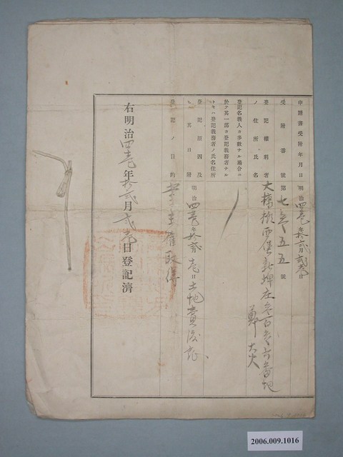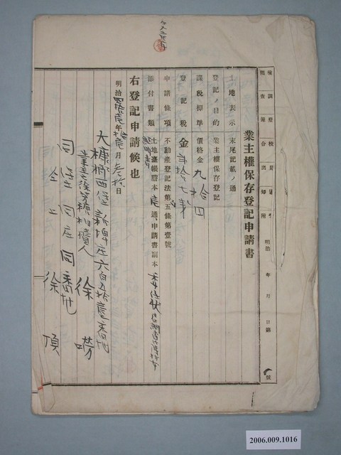 2006.009.1016 明治41年徐嘮與徐頂業主權保存登記申請書
