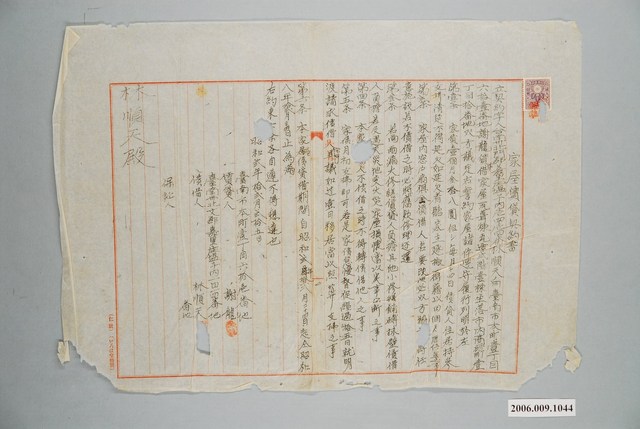 2006.009.1044 昭和2年臺南市謝龍給北文郡嘉里庄林順天家屋賃貸契約書