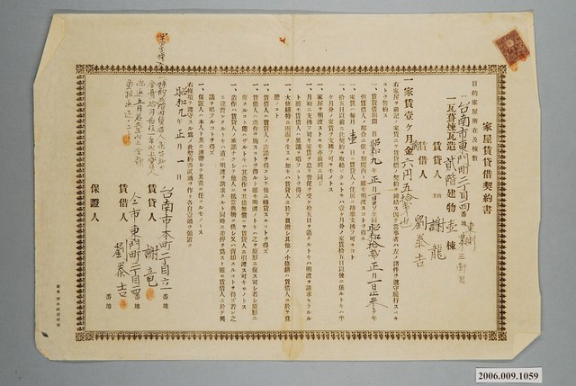 2006.009.1059 昭和9年臺南市謝龍給劉泰吉家屋賃貸借契約書