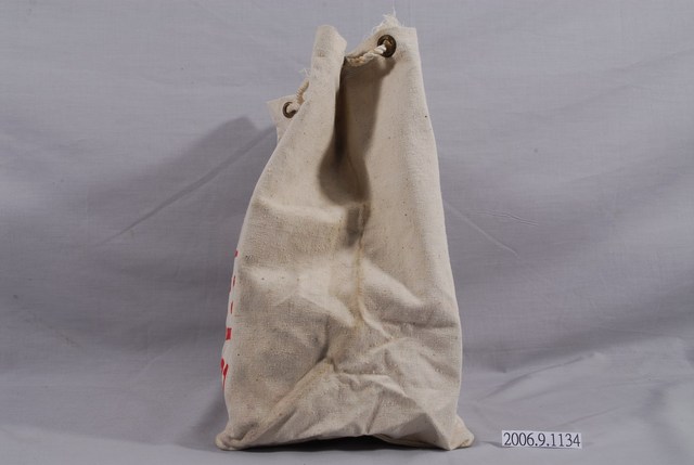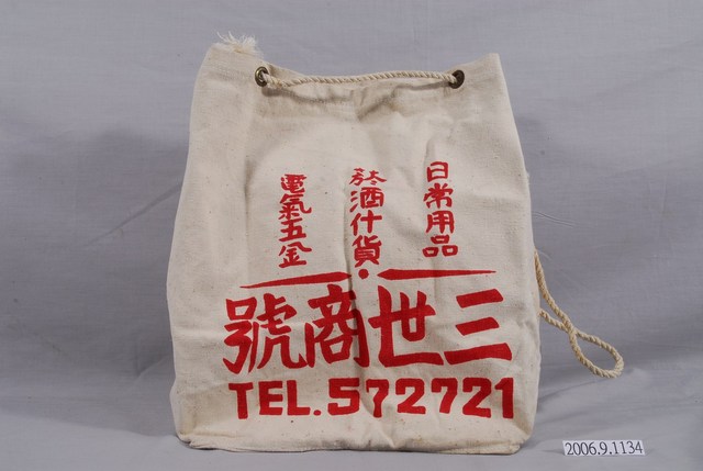 1.本物件為三世商號帆布袋,袋子為米白色,袋上正反兩面以紅色印有三世商號所販售的物品及電話,袋上共有四個孔洞並穿過一條白色繩子作為提把。