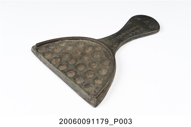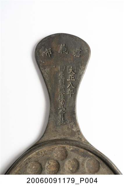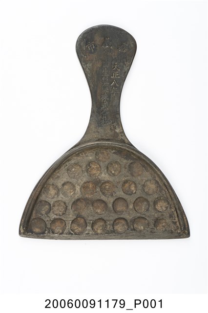 本物件為大正8年嘉義市回生製藥株式會社數藥丸器具。器具似鏟子,有握柄,半圓型鏟面上有25個圓洞。握柄處有嘉義市回生製藥株式會社與大正五年(1919)字樣。