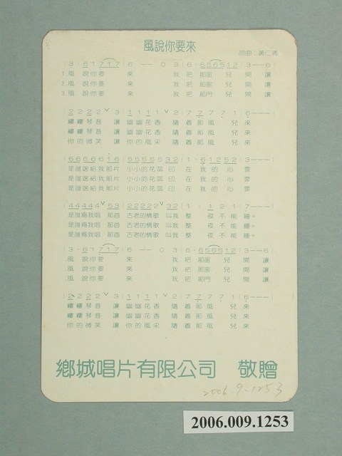 1.臺灣女星龍飄飄的明星照片小卡,直式印刷。畫面主要呈現龍飄飄身著藍白色背心,撫弄頭髮的半身特寫,搭配「風說你要來」、「龍飄飄」字樣。背面印有〈風說你要來〉歌譜。2. 造型出自《風說你要來》專輯封面,1981年12月由城鄉唱片發行。