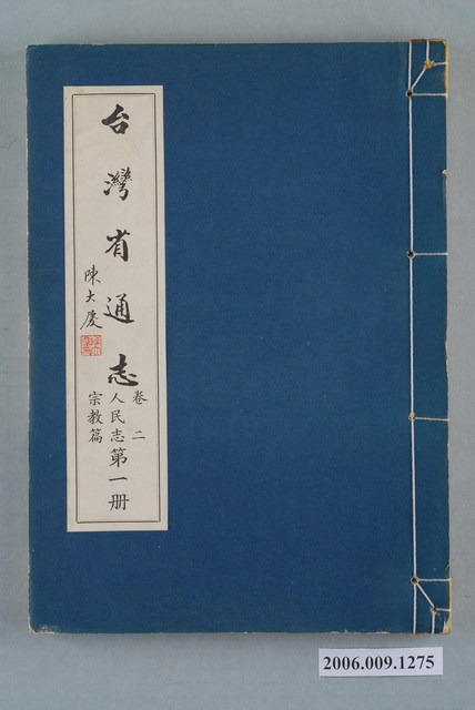 1.本物件為臺灣省文獻委員會出版的《臺灣省通志》卷二人民志宗教篇第一冊,採線裝裝訂。封面、封底底圖均為藍色,由目次可知內文分為概說、道教、佛教、天主教、基督教、回教、理教、軒轅教、大同教、通俗信仰等10章,最後並附上臺灣省寺廟一覽表;目次之後為4頁的照片頁,照片頁後為內文;本冊敘述的是第1章概說至第4章第3節日據時期臺灣之天主教之內容。2.1948年6月,臺灣省通志館成立,由林獻堂任館長,主持臺灣省通志纂修事宜。1949年,臺灣省通志館改為臺灣省文獻委員會(簡稱省文獻會);1951年,內政部核備臺灣省通志稿纂修綱目,開始撰稿。先後在1960年完成大部分的篇章(斷限至戰後初期),以及1967年完成增修(斷限至1961年)。由於1960年的原修稿與1967年的增修稿作者眾多,難以連貫,相互牴觸之處不少,以致難以付梓,1966年,省文獻會成立整理小組,展開通志稿整修計畫,調整原志綱目,制定整修辦法,以省文獻會主任委員張炳楠為監修,副主任委員李汝和、林衡道為主修兼總編纂,開始整修計畫。1973年6月,臺灣省通志全書完成出版,不含卷首、卷尾,共10卷、10志、78篇、146冊,總字數約1,877萬字。本物件人民志宗教篇共有5冊,於1971年6月30日出版。