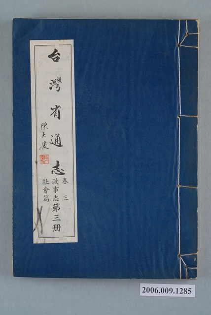 1.本物件為臺灣省文獻委員會出版的《臺灣省通志》卷三政事志社會篇第三冊,採線裝裝訂。封面、封底底圖均為藍色。本志分為社會行政、人民團體、社會事業、合作事業等4章,本冊敘述的是第3章第3節光復以來之社會事業後半部的內容。2.1948年6月,臺灣省通志館成立,由林獻堂任館長,主持臺灣省通志纂修事宜。1949年,臺灣省通志館改為臺灣省文獻委員會(簡稱省文獻會);1951年,內政部核備臺灣省通志稿纂修綱目,開始撰稿。先後在1960年完成大部分的篇章(斷限至戰後初期),以及1967年完成增修(斷限至1961年)。由於1960年的原修稿與1967年的增修稿作者眾多,難以連貫,相互牴觸之處不少,以致難以付梓,1966年,省文獻會成立整理小組,展開通志稿整修計畫,調整原志綱目,制定整修辦法,以省文獻會主任委員張炳楠為監修,副主任委員李汝和、林衡道為主修兼總編纂,開始整修計畫。1973年6月,臺灣省通志全書完成出版,不含卷首、卷尾,共10卷、10志、78篇、146冊,總字數約1,877萬字。本物件政事志社會篇共有5冊,於1971年6月30日出版。