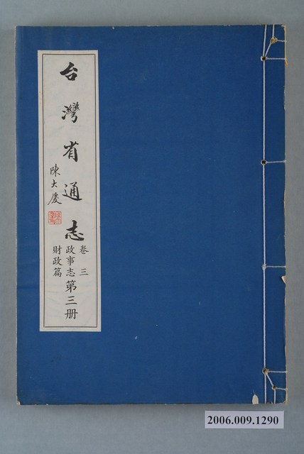 1.本物件為臺灣省文獻委員會出版的《臺灣省通志》卷三政事志財政篇第三冊,採線裝裝訂。封面、封底底圖均為藍色。本篇分為財政概況、賦稅、公賣及專賣、糧政、鹽政、海關等6章,本冊所撰述的內容為第3章公賣及專賣和第4章糧政。2.1948年6月,臺灣省通志館成立,由林獻堂任館長,主持臺灣省通志纂修事宜。1949年,臺灣省通志館改為臺灣省文獻委員會(簡稱省文獻會);1951年,內政部核備臺灣省通志稿纂修綱目,開始撰稿。先後在1960年完成大部分的篇章(斷限至戰後初期),以及1967年完成增修(斷限至1961年)。由於1960年的原修稿與1967年的增修稿作者眾多,難以連貫,相互牴觸之處不少,以致難以付梓,1966年,省文獻會成立整理小組,展開通志稿整修計畫,調整原志綱目,制定整修辦法,以省文獻會主任委員張炳楠為監修,副主任委員李汝和、林衡道為主修兼總編纂,開始整修計畫。1973年6月,臺灣省通志全書完成出版,不含卷首、卷尾,共10卷、10志、78篇、146冊,總字數約1,877萬字。本物件政事志財政篇共有4冊,於1970年6月30日出版。
