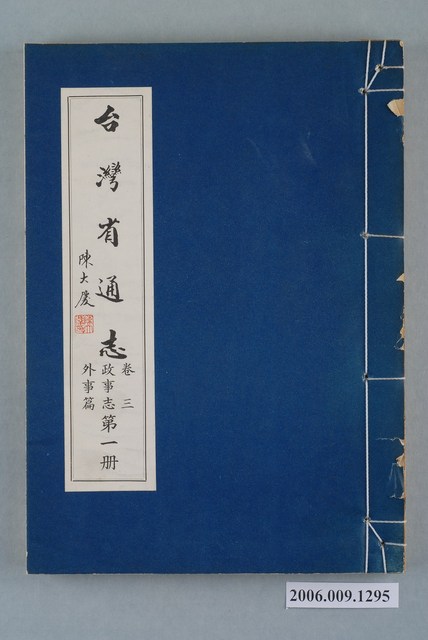 1.本物件為臺灣省文獻委員會出版的《臺灣省通志》卷三政事志外事篇第一冊,採線裝裝訂。封面、封底底圖均為藍色,由目次可知內文分為早期臺灣之涉外事件、清代臺灣對外關係之演變、割讓臺澎之經過、日據時期之外事、光復後之外事等5章;本冊敘述的是第1章早期臺灣之涉外事件全章,以及第2章清代臺灣對外關係之演變的前半部內容。2.1948年6月,臺灣省通志館成立,由林獻堂任館長,主持臺灣省通志纂修事宜。1949年,臺灣省通志館改為臺灣省文獻委員會(簡稱省文獻會);1951年,內政部核備臺灣省通志稿纂修綱目,開始撰稿。先後在1960年完成大部分的篇章(斷限至戰後初期),以及1967年完成增修(斷限至1961年)。由於1960年的原修稿與1967年的增修稿作者眾多,難以連貫,相互牴觸之處不少,以致難以付梓,1966年,省文獻會成立整理小組,展開通志稿整修計畫,調整原志綱目,制定整修辦法,以省文獻會主任委員張炳楠為監修,副主任委員李汝和、林衡道為主修兼總編纂,開始整修計畫。1973年6月,臺灣省通志全書完成出版,不含卷首、卷尾,共10卷、10志、78篇、146冊,總字數約1,877萬字。本物件政事志外事篇共有3冊,於1971年6月30日出版。