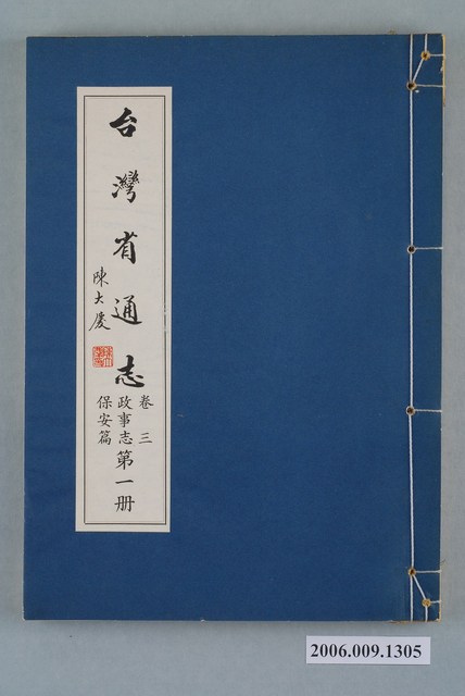 1.本物件為臺灣省文獻委員會出版的《臺灣省通志》卷三政事志地方保安篇第一冊,採線裝裝訂。封面、封底底圖均為藍色,由目次可知內文分為概說、明鄭時代及清代之保安、日據時期之保安、光復後之保安等4章,本冊所敘述的是第1章概說到第3章日據時期之保安的全部內容。2.1948年6月,臺灣省通志館成立,由林獻堂任館長,主持臺灣省通志纂修事宜。1949年,臺灣省通志館改為臺灣省文獻委員會(簡稱省文獻會);1951年,內政部核備臺灣省通志稿纂修綱目,開始撰稿。先後在1960年完成大部分的篇章(斷限至戰後初期),以及1967年完成增修(斷限至1961年)。由於1960年的原修稿與1967年的增修稿作者眾多,難以連貫,相互牴觸之處不少,以致難以付梓,1966年,省文獻會成立整理小組,展開通志稿整修計畫,調整原志綱目,制定整修辦法,以省文獻會主任委員張炳楠為監修,副主任委員李汝和、林衡道為主修兼總編纂,開始整修計畫。1973年6月,臺灣省通志全書完成出版,不含卷首、卷尾,共10卷、10志、78篇、146冊,總字數約1,877萬字。本物件政事志保安篇共有2冊,於1970年6月30日出版。