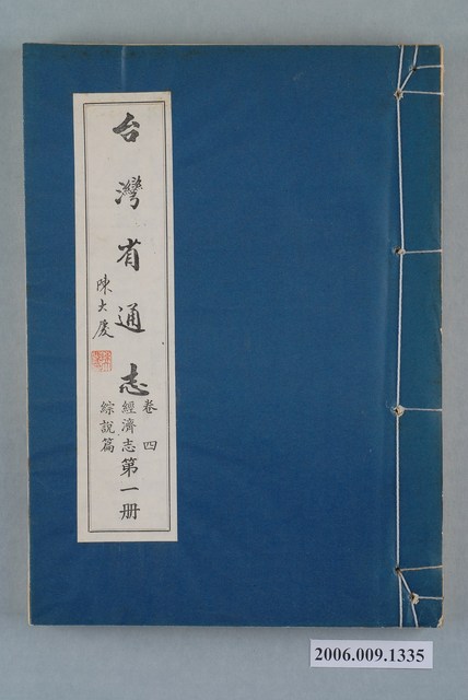 1.本物件為臺灣省文獻委員會出版的《臺灣省通志》卷四經濟志綜說篇第一冊,採線裝裝訂。封面、封底底圖均為藍色,由目次可知內文分為概說、原始經濟與漢人移臺墾殖、荷西竊據時期之經濟、明鄭時代之經濟開發、清代之經濟發展、日據時期之經濟開發、日據中期之經濟與其發展、日據末期經濟之崩潰、光復後之接收與經濟復甦、光復後十餘年來經濟建設之發展等10章,文末附上農林工礦漁牧等業歷年產銷及物價指數統計圖表;本冊收錄的是第1章概說到第6章日據時期之經濟開發的全部內容,以及第7章日據中期之經濟與其發展的前半部內容。2.1948年6月,臺灣省通志館成立,由林獻堂任館長,主持臺灣省通志纂修事宜。1949年,臺灣省通志館改為臺灣省文獻委員會(簡稱省文獻會);1951年,內政部核備臺灣省通志稿纂修綱目,開始撰稿。先後在1960年完成大部分的篇章(斷限至戰後初期),以及1967年完成增修(斷限至1961年)。由於1960年的原修稿與1967年的增修稿作者眾多,難以連貫,相互牴觸之處不少,以致難以付梓,1966年,省文獻會成立整理小組,展開通志稿整修計畫,調整原志綱目,制定整修辦法,以省文獻會主任委員張炳楠為監修,副主任委員李汝和、林衡道為主修兼總編纂,開始整修計畫。1973年6月,臺灣省通志全書完成出版,不含卷首、卷尾,共10卷、10志、78篇、146冊,總字數約1,877萬字。本物件經濟志綜說篇共有2冊,於1971年6月30日出版。