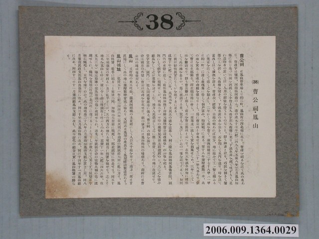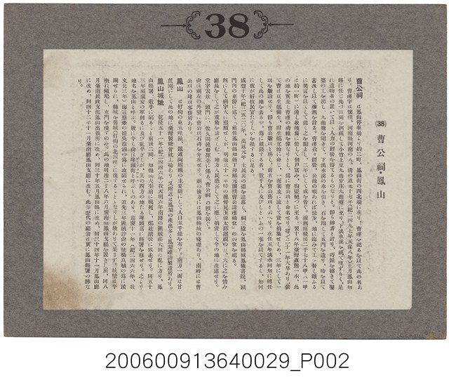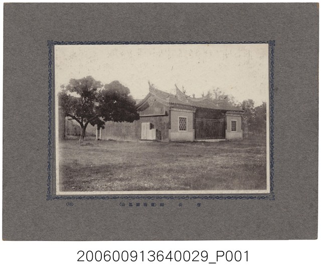 1. 本物件為曹公祠、鳳山黑白照片及文字說明。照片題名「曹公祠(臺南廳鳳山)」,在一棵大樹旁邊有著一座閩式建築的廟宇,其有著歇山式的屋頂,即為曹公祠,曹公祠前是一大片空地。文字說明的題名是「(38)曹公祠‧鳳山」,有三個小題名:第一部分題名為「曹公祠」,曹公祠之來源是由於鳳山知縣曹瑾,曹瑾為河南縣河南人,清道光17年到鳳山任知縣,開設曹公圳,利於灌溉,而被推崇,咸豐10年建廟宇感念曹瑾;第二部分題名為「鳳山」之介紹,鳳山在打狗(按:高雄)的東邊距離五哩餘,為鐵道阿緱線主要的驛站。其南邊有臺灣製糖會社工場,此地亦產出許多鳳梨,有鳳梨罐頭製造所。第三部分為「鳳山城址」,說明鳳山自清朝的建城概況,以及日本領臺後,從臺南民政支部鳳山出張所變更到鳳山廳,鳳山行政區域的演變概況。2. 曹公祠,今稱曹公廟,位於高雄市鳳山區。