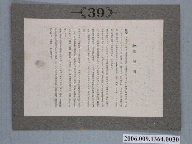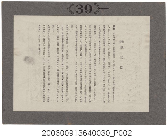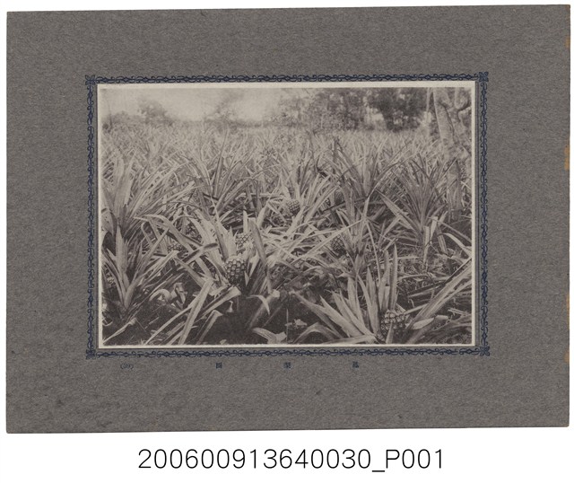 1. 本物件為鳳梨園黑白照片及文字說明。照片題名為「鳳梨園」,遠景為栽種十分密集且面積寬闊的鳳梨園,近景鳳梨形狀如松毬,其葉子長條且呈現出稍微鋸齒狀。文字說明的題名是「(39)鳳梨園」,介紹鳳梨的科屬,鳳梨科鳳梨屬,味道酸甘,原產地為熱帶地區,以及臺灣的鳳梨栽種情形。2. 鳳梨又稱菠蘿、王梨、旺來。臺灣栽培鳳梨的歷史始於清朝康熙末年,目前臺灣主要種質的鳳梨品種可分為在地種、外來種以及混雜後的雜交改良種,以臺農一號至二十一號命名,並大力栽植。