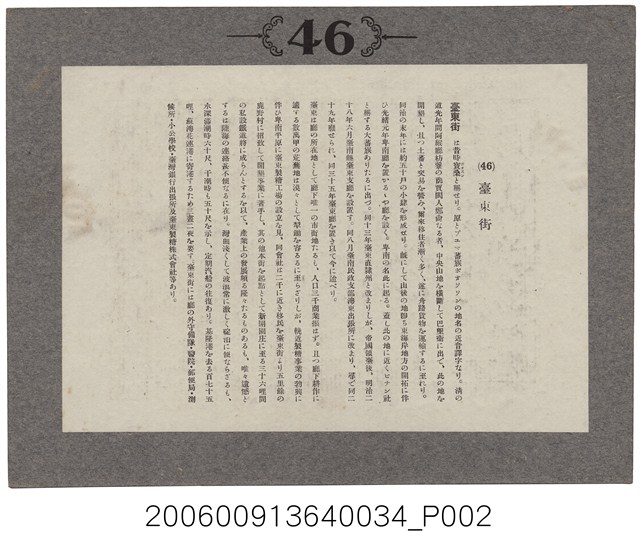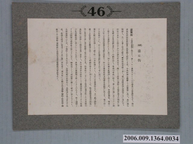 1. 本物件為以臺東街黑白照片及文字說明。照片題名「臺東街」,為臺東街景照,遠景有數位行人走動、有背負物品的人們,道路兩旁是房屋比鄰,近景右方屋舍有用竹子圍成的圍籬、養家禽,左方是一幢外觀構造完整的大型建築物。文字說明的題名為「(46)臺東街」,臺東舊名「寶桑」,是與蕃族所稱的此地名音譯相近而有此名。清道光年間,阿猴廳的枋寮商賈漢人鄭尚到此居住並與原住民交易,爾後移住者漸多。日本領臺後,明治28年設置臺南縣臺東之廳。臺東廳的所在地是臺東唯一的市街地,距離基隆港175哩、離蘇澳花蓮港要三天二夜,臺東街有守備隊、醫院、郵局、測候所、小公學校、臺灣銀行出張所及臺東製糖株式會社。2. 臺東街,轄屬臺東廳臺東郡,是西元1920年至1945年間存在之行政區。